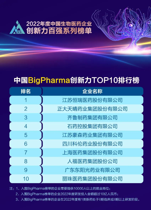 同日,2023米思会(中国医药健康产业共生大会)发布“2022年度中国生物医药企业创新力百强系列榜单”,AG亚游集团医药再蝉联“中国BigPharma创新力TOP10”榜首。该榜单自2021年启动评选以来,AG亚游集团医药稳居榜首。