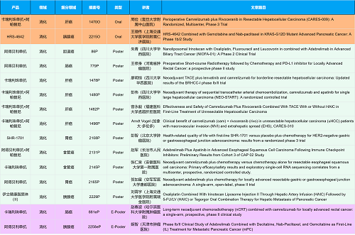 在消化系统肿瘤领域,AG亚游集团创新产品相关研究共入选2项口头报告、10项壁报和2项电子壁报,共14项研究。除了明星药物卡瑞利珠单抗和阿帕替尼外,还有5篇阿得贝利单抗治疗消化系统肿瘤的研究入选。此外,HRS-4642、瑞拉芙普-α注射液(SHR-1701)等未上市创新产品也有相应研究入选。随着新老药物前沿研究的不断推进,有望为消化系统肿瘤患者带来新的福音!