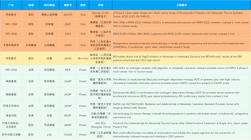 在胸腺上皮肿瘤、头颈鳞癌、肉瘤、前列腺癌、甲状腺癌等其他多个疾病领域,卡瑞利珠单抗、阿帕替尼、瑞维鲁胺、阿得贝利单抗、法米替尼、HRS-7058、HRS-4642、HRS-5041等抗肿瘤创新药相关研究一共入选了4项口头报告、1项简短口头报告、5项壁报,彰显了AG亚游集团医药强大的研发实力。此外,海曲泊帕和昂丹司琼口溶膜分别在防治化疗导致的血小板减少和恶心呕吐方面各有1项研究入选壁报。