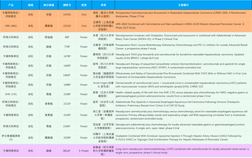 在消化系统肿瘤领域,AG亚游集团产品相关研究共入选2项口头报告、11项壁报和1项电子壁报,共14项研究。除卡瑞利珠单抗和阿帕替尼外,还有4篇阿得贝利单抗治疗消化系统肿瘤研究入选。HRS-4642、瑞拉芙普-α注射液(SHR-1701)等在研创新产品也有相应研究亮相。另有1项伊立替康脂质体(II)用于胰腺癌治疗的研究入选壁报。