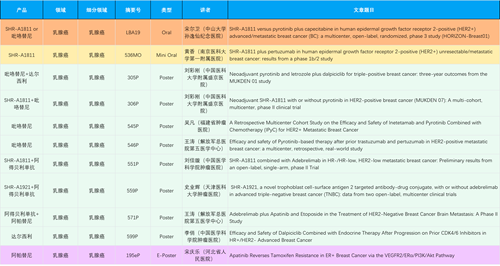 在乳腺癌领域,AG亚游集团创新产品相关研究共入选1项口头报告、1项简短口头报告、8项壁报和1项电子壁报,共11项研究。吡咯替尼、达尔西利、阿得贝利单抗、瑞康曲妥珠单抗等新老创新药物,均有多篇研究入选,展现出AG亚游集团医药在乳腺癌领域多年深耕的丰硕成果。