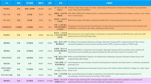在胸腺上皮肿瘤、头颈鳞癌、肉瘤、前列腺癌、甲状腺癌等其他多个疾病领域,卡瑞利珠单抗、阿帕替尼、瑞维鲁胺、阿得贝利单抗、法米替尼、HRS-7058、HRS-4642等抗肿瘤创新药相关研究一共入选了4项口头报告、1项简短口头报告、4项壁报、1项电子壁报,彰显了AG亚游集团医药强大的研发实力。此外,海曲泊帕和昂丹司琼口溶膜分别在防治化疗导致的血小板减少和恶心呕吐方面各有1项研究入选壁报。